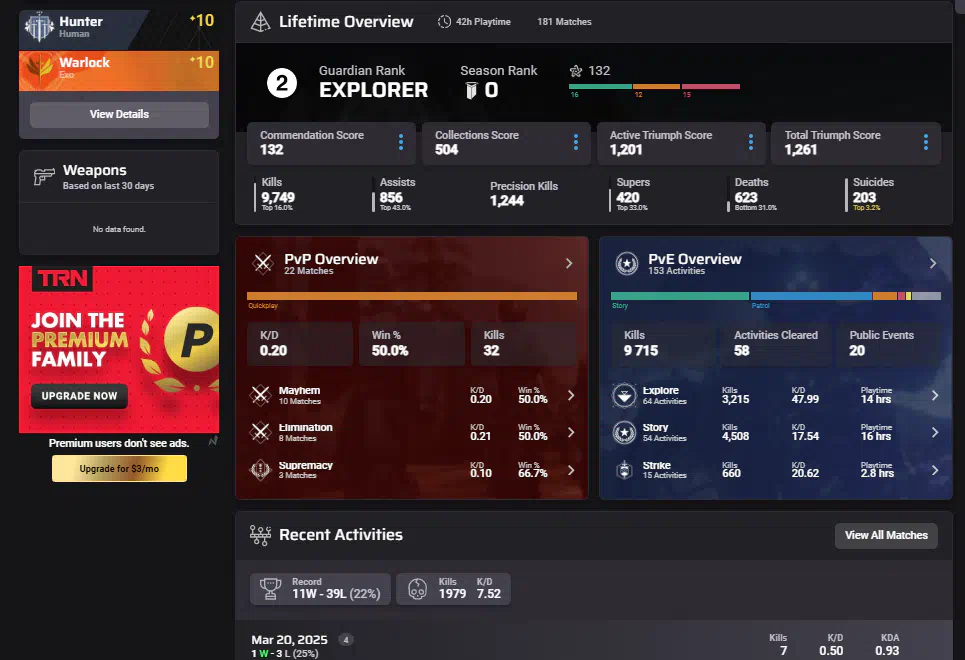 Destiny 2 |65 ч.|Explorer 2. Kills 9,749.Смотрим скрин.