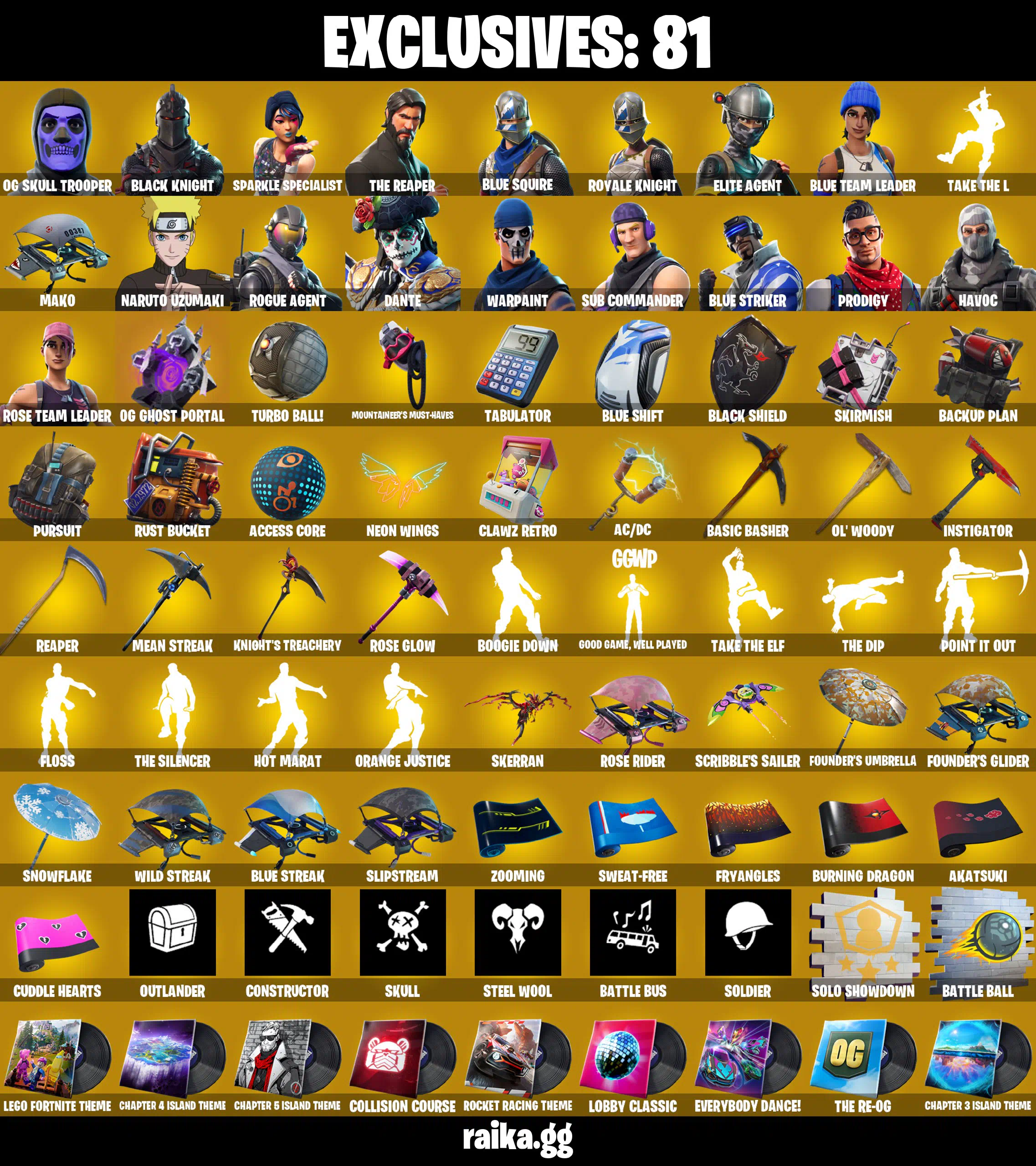 121 Skins | OG Skull Trooper | Black Knight | The Reaper | Omega | Dire | Drift | Floss | Take The L | OG STW |