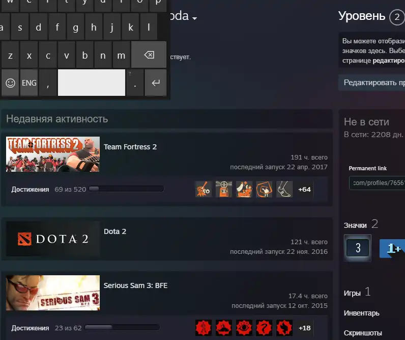 Dota |121 hours|(I am not responsible for the rating). Team Fortress 2|191 hours |Online: 2208 days back
